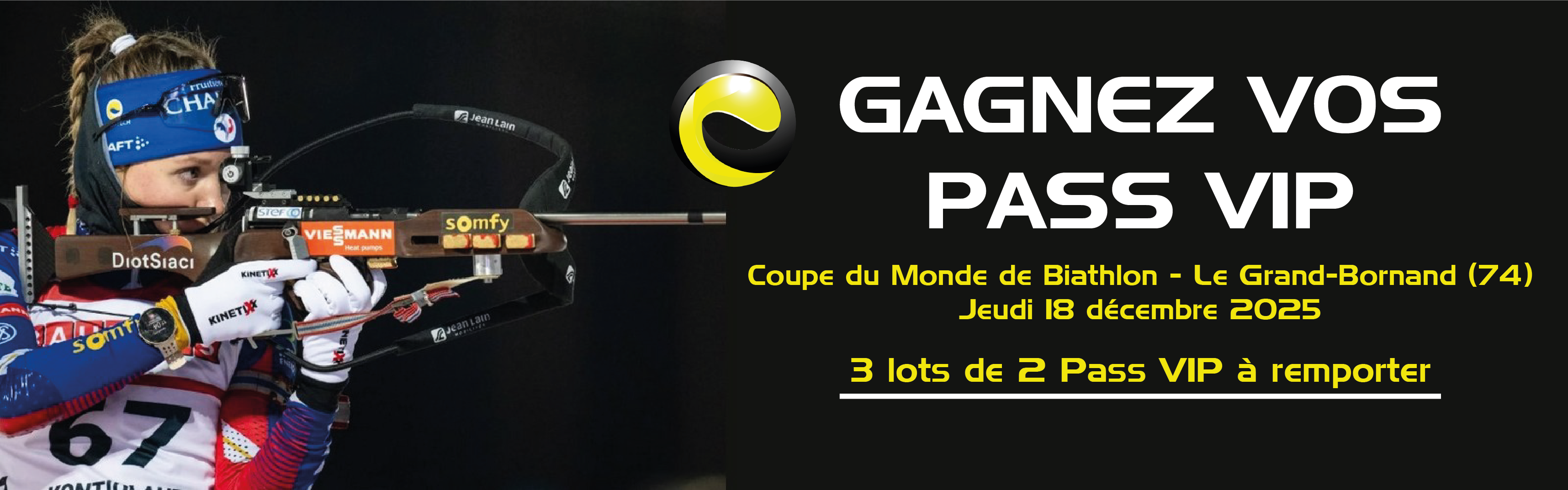Chaque gagnant recevra 2 Pass VIP pour la Coupe du Monde de Biathlon au Grand-Bornand, valable le jeudi 18 décembre 2025. Chaque Pass VIP inclut : l’accueil café, le cocktail déjeunatoire, le service bar (vins, bières, softs) dans le tipi, l’accès terrasse VIP en bord de piste, et une rencontre avec l’athlète Océane MICHELON (sauf imprévu exceptionnel indépendant de sa volonté).
